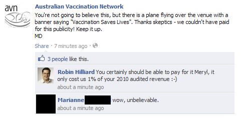 And as the decent folk at the Woodford Folk Festival look to the sunny Queensland skies, a banner towed by a light aircraft will broadcast our simple message: Vaccination Saves Lives. A bold, positive message, costing less than 1% of the annual revenue of Dorey’s anti-vaccination media business and paid for by grassroots Stop AVN members personally.