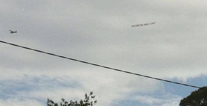Vaccinations Save Lives: the plane-towed banner at Woodford