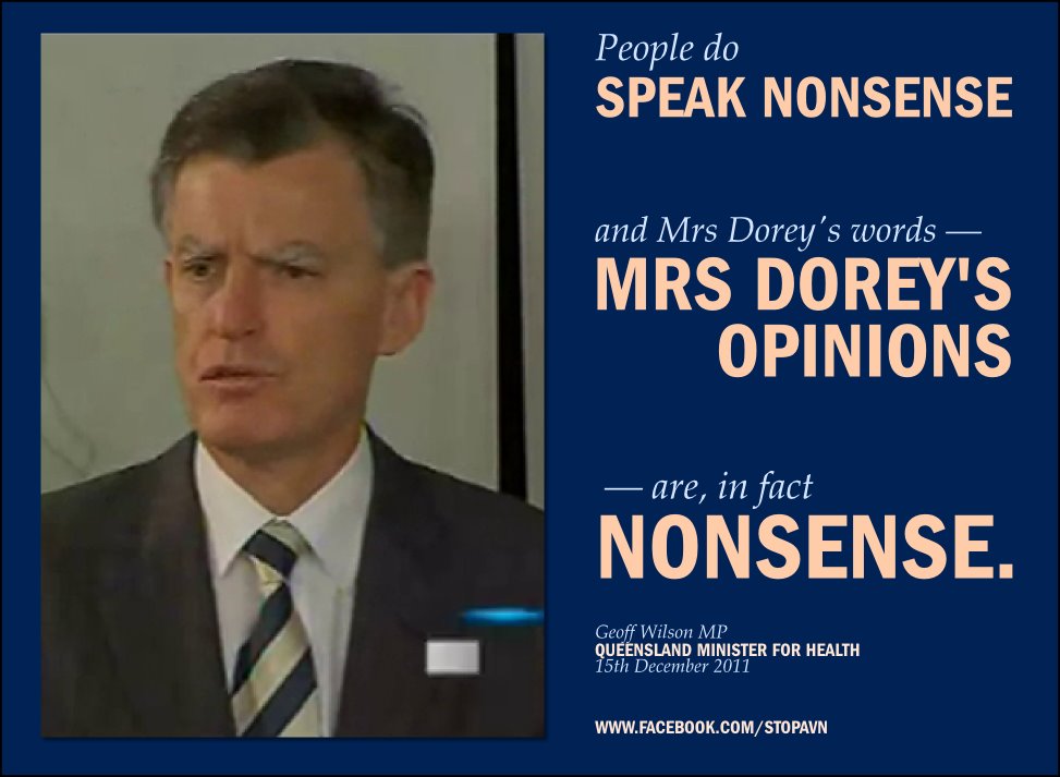 We even had a statement from the Queensland Minister for Health, Geoff Wilson, decrying Dorey’s ‘nonsense’.